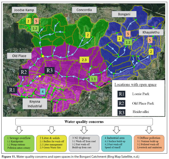 Identifying the areas of the Bongani River catchment that contributed significant amounts of pollution was an important aspect of the study. Figure 11 shows some of the problem areas identified in the catchment and selected locations where there was open space available for SuDS.