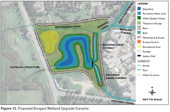 The Bongani Wetland Upgrade Scenario (Fig. 13) involved a retrofit of the current Bongani Wetland. This involved modelling 2 sediment forebays -small ponds designed to slow stormwater to allow sedimentation, which removes various pollutants from the influent stormwater and helps to prevent siltation of the Bongani Wetland (Fig. 12). These then spill into the constructed wetland downstream. A storm exceedance channel directs large flows away from the wetland to reduce the risk of damage to it.