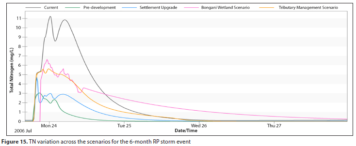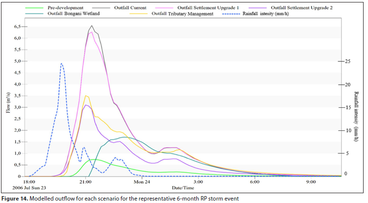 Figure 14 presents the modelled total outflow hydrographs for the various scenarios. Although the graphs presented are theoretical, they show the likely relative impact of the different scenarios on pollutant transport from the Bongani River into the Ashmead Channel. The figure shows: