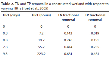 A link between pollutant removal and hydraulic retention time (HRT) in wetlands has been observed in several studies. A study undertaken by Toet et al. (2005) recorded pollutant removal values for different HRTs in Texel, Netherlands. They collected TN and TP removal data from a sewage treatment wetland with 4 different HRTs (0.3, 0.8, 2.3, and 9.3 days) (Table 2).