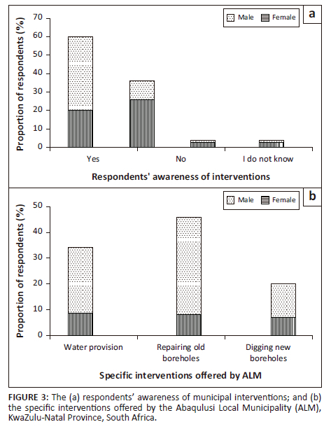 When asked about any potential interventions rendered by ALM during the most recent and other drought events, 40% of the female and 20% of male HH respondents indicated awareness of some form of assistance from ALM (Figure 3a). More males (26%) than females (10%) were unaware that the local municipality aided the community in adapting. Regarding the specific interventions offered by ALM, water provision services ranked high (Figure 3b). More females (38%) than males (8%) mentioned that ALM mainly repaired the non-functioning boreholes to improve water availability for household use.