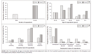 The study's findings revealed that ALM has a high unemployment rate, as slightly more than half of the participants (53%) indicated that they were not formally employed (Figure 2-A1). More females (37%) than males (16%) were unemployed, while a small proportion of the study population was formally employed (10%). Formal employment was mainly through government as civil servants, while others were employed in the private sector. Only 10% of the participants indicated that they were working in other sectors, such as domestic work, where they did not need to sign any contract but received a monthly income. The rest of the study population (37%) indicated that they were self-employed and made a living through home entrepreneurship (selling groceries and clothes) and farming as a source of livelihood.