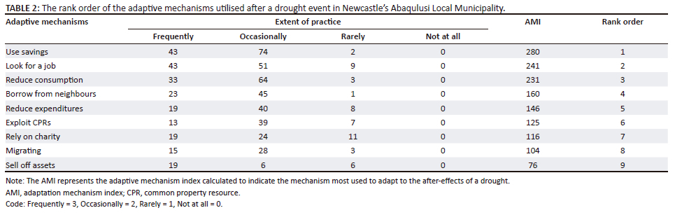 Households in developing countries have established various informal mechanisms to cope with unanticipated disasters such as droughts. Understanding these strategies in the context of climate change will enhance the design of locally applicable adaptation mechanisms. This study aimed to investigate a South African rural community's adaptive mechanisms during- and ex-post-drought. Questionnaires were administered to 200 household heads, and five focus group discussions were held with selected community members. An index was computed to establish each adaptive mechanism's importance (termed the rank order) relative to its use in the study area. During droughts, borrowing from neighbours was the most commonly used mechanism by households with no savings, while sharecropping was the second most used mechanism. Ex-post-droughts, using savings was the primary strategy for community members who had savings, followed by seeking employment as the second most used strategy.