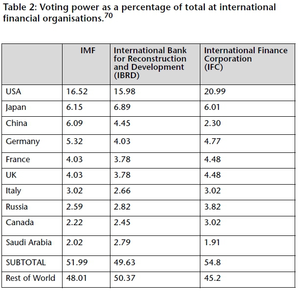 The IMF is the gatekeeper for World Bank credit55 and aid flows,56and is an important player in global development.57 The IMF will impact survival rights when privatisation is promoted or if a restriction on social spending prohibits a country's ability to provide for all.58The World Bank decides about credit allocation and to whom low-interest loans are awarded. The scale of their portfolio makes oversight difficult, and criticisms include their corrupting influence, with 10 to 40 per cent of loans and grants lost due to a lack of fiduciary oversight,59 corruption impacts the efficiency with which a government provides survival rights.60 Voting power at the IMF and World Bank is skewed towards high-income countries (see Table 2). The failure of countries to meet their obligations to provide survival rights, as a result of the policies of international organisations is the responsibility of the countries that have delegated powers to them.