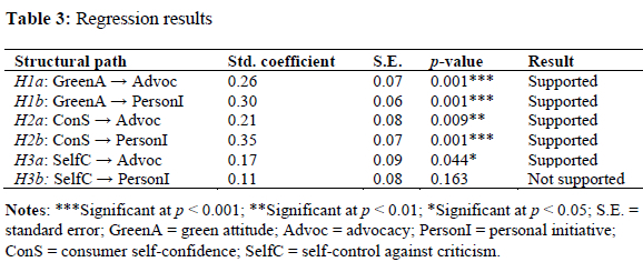 As per table 3, all regression relationships are positive and range between 0.11 and 0.35. The table shows that the effect of a green attitude on personal initiative is larger than a green attitude's impact on advocacy. Similarly, the influence of consumer self-confidence on personal initiative was larger than the effect of consumer self-confidence on advocacy. Self-control against criticism only seems to significantly influence advocacy (coefficient = 0.17,p < 0.05). Therefore, H1a, H1b, H2a, H2b, and H3a were supported. Overall, table 3 indicates that green attitude has the largest impact on advocacy, followed by consumer self-confidence and self-control against criticism. Consumer self-confidence has the largest impact on personal initiative, followed by a green attitude.