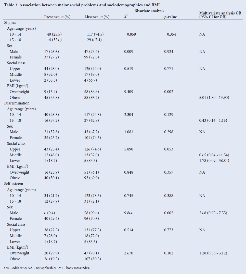 Among the major social problems, obesity was associated with stigmatisation and this was statistically significant (X2=9.409; p=0.002). Those obese children were about five times more likely to feel stigmatised than the overweight (OR 5.01; 95% CI 1.80-13.90) (Table 3). Low self-esteem was more common among the females compared with males and this was statistically significant (X2=9.866, p=0.002). On multivariate analysis, the females were ~3 times more likely to have low self-esteem than males (OR 2.68, 95% CI 0.95 - 7.55). The late adolescents were ~2 times more likely to feel discriminated against than the early adolescents (OR 0.43; 95% CI 0.16 - 1.15). Those children in the middle class were ~2 times less likely (OR 0.65; 95% CI 0.04 - 11.54) and those in lower class ~2 times more likely to feel discriminated against than those in the upper class (OR 1.78; 95% CI 0.09 - 36.84) (Table 3).