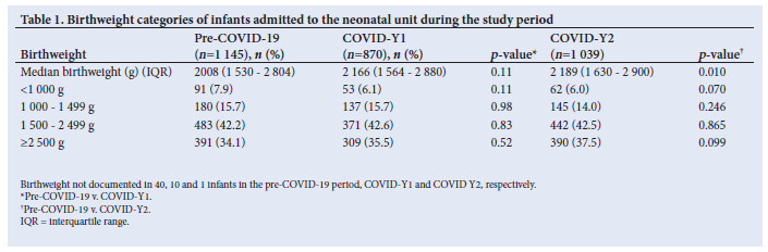 The median birthweight of admitted infants pre-COVID-19 was 2 008 g (interquartile range (IQR) 1 530 - 2 804 g), compared with 2 166 g (IQR 1 564 - 2 880 g) in COVID-Y1 (p=0.110) and 2 189 g (IQR 1 630 - 2 900 g) in COVID-Y2 (p=0.010). No significant differences were found between birthweight categories (Table 1).