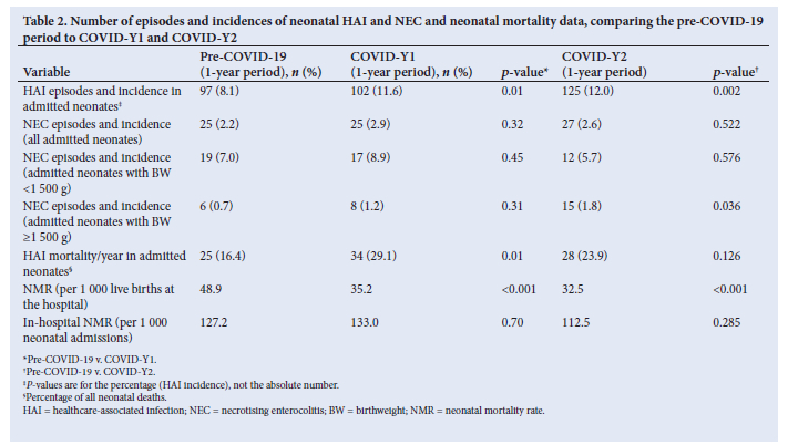 This research formed part of the Tshwane Maternal-Child COVID-19 study. All neonates admitted to the Steve Biko Academic Hospital neonatal unit were included in this study. This tertiary neonatal unit provides medical and surgical care to neonates from Tshwane and surrounding provinces. The neonatal unit consists of 39 beds, which include 10 neonatal intensive care beds; however, this unit is usually full to above capacity. For this study, 'pre-COVID-19' refers to April 2019 - March 2020, 'COVID-year-1' (COVID-Y1) to April 2020 - March 2021, and 'COVID-year-2' (COVID-Y2) to April 2021 - March 2022. Data for the neonatal unit were extracted from its database, while outpatient information was obtained from the outpatient register.