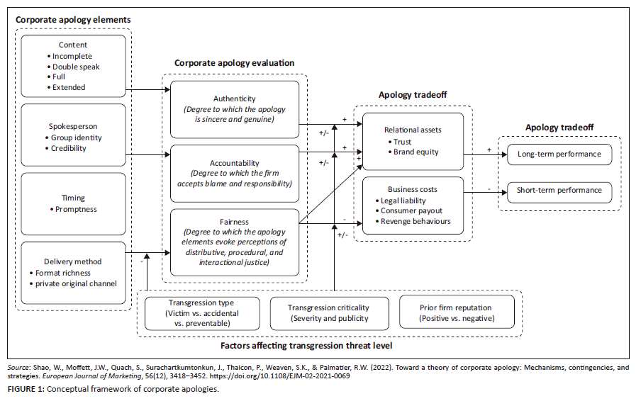 In the realm of corporate apologies, Shao et al. (2022) developed a holistic corporate apology framework, by qualitatively analysing 40 corporate apology statements in conjunction with an analysis of existing corporate apology literature. The framework these authors developed is presented (exactly as it is presented in the original article) in Figure 1.