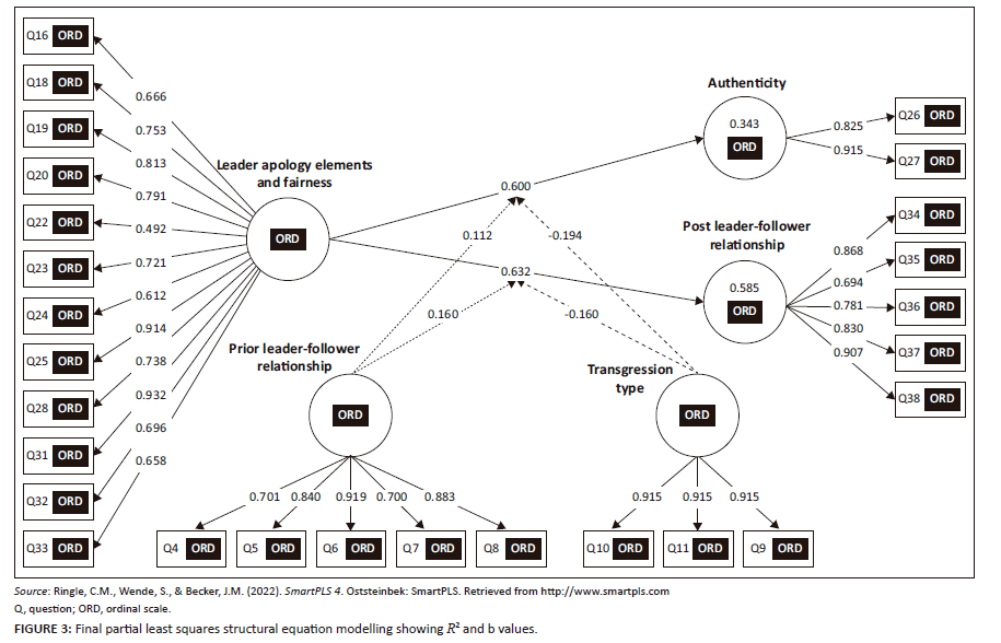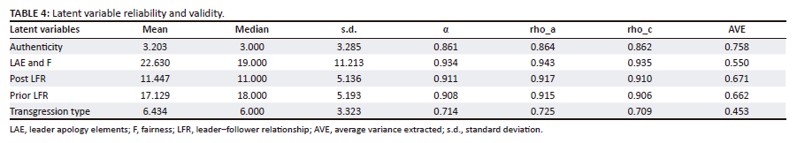 Most outer loadings exceeded 0.500, except Q22's loading of 0.492. Q22 was retained, because loadings exceeded 0.700 per latent variable overall. Reliability was acceptable as Cronbach alpha coefficients (α) all exceeded 0.700, and composite reliability (rho_c) exceeded 0.700. It should, however, be noted that the Cronbach alpha coefficient of leader apology effectiveness and fairness exceeded 0.900, as did its composite reliability, indicating possible indicator redundancy, which could impact content validity. The average variance extracted (AVE) exceeded 0.550 except for Transgression type: 0.453, because of Q11 (0.539). Q11 was not removed from the model as doing so would have lowered the AVE. Overall, therefore convergent validity was deemed acceptable. Full reliability and descriptive statistics are provided in Table 4.