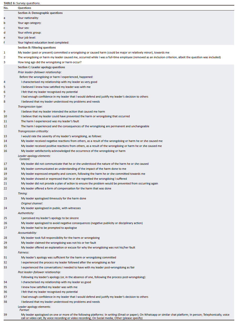 To assess the independent variable, LAEs, as well as two of the dependent variables (fairness and authenticity), new items were constructed by the authors. The same five items from Radulovic et al.'s (2019) seven-item LMX scale were used to assess the remaining dependent variable, post LFR and the moderating variable, prior LFR, Radulovic et al.'s (2019) original scale spoke to a hypothetical scenario; therefore, items were edited such that they were no longer scenario specific. Items assessing prior LFRs were prefaced, '[before] the wrongdoing or harm I experienced', while post LFRs were prefaced, '[following] my leader's apology (or, in the absence of one, following the process post-wrongdoing)'. Again, for the second moderating variable, Transgression type, new items were constructed by the authors. Questions were edited to take into account feedback received from pilot study participants. The final questionnaire is provided in Table 6 at the end of this article. In addition to the filtering question mentioned under the 'Research participants' section, two more filtering questions were added. The first (Q2) checked whether or not participants were fulltime employees. However, this requirement was removed early on in the data collection phase to broaden the sample base, and while the question was included, a 'yes' was not required to continue through the questionnaire. The second (Q3) filtering question ascertained how long ago the wrongdoing occurred in order to account for possible effects of the passage of time on memory. Six questions (Questions a-f) were included to collect demographic information concerning the sample gathered (sex, nationality, qualification level, job level, age and ethnicity). This was done in order to provide a detailed description of the eventual sample while still maintaining respondent anonymity. The questionnaire was pretested by three people, followed by slight edits to enhance user-friendliness and logical flow.
