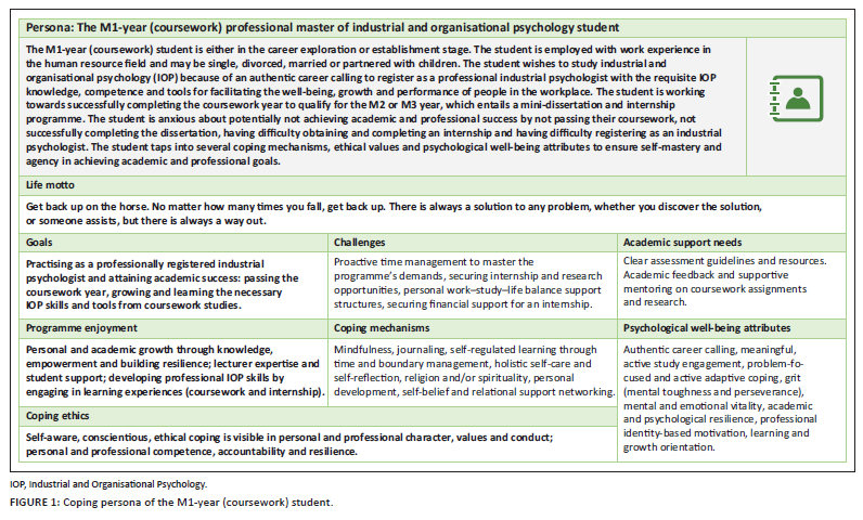 In step 3, the researchers created a persona skeleton that contained relevant data and underlying themes with descriptions that could be used to further develop the persona character (Adlin et al., 2006; Pruitt & Adlin, 2010; Zagallo et al., 2019). Step 4 involved evaluating and refining the initial skeleton to develop a unique master's student coping persona. In step 5, the coding summaries were used to identify the key characteristic attributes of each theme that emerged. The most defining attribute was used to create the persona's name. In this respect, the researchers used the homogenous group attribute, Professional Master of Industrial and Organisational Psychology Student, as the persona name. The researchers did not add a persona picture of a real-world individual as per the typical persona methodology convention because prior studies showed that such pictures trigger biases and preconceptions in those who study and use them. Also, the sample had a multiculturally diverse race and gender profile that could not be depicted in a single persona picture (Zagallo et al., 2019). Representative quotes were selected from the sample of participants to illustrate the key coping characteristics of the master's student persona. Finally, in step 6, the researchers engaged in validating the respective persona by obtaining consensus from a third researcher that the persona appropriately aligned with the response data.