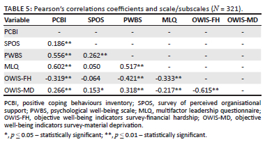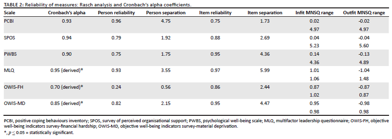 Table 2 presents a summary of key psychometric properties for several psychological scales, including the PCBI, SPOS, PWBS, MLQ, OWIS-Financial Hardship (FH) and OWIS-Material Deprivation (MD). Table 2 provides values for the Cronbach's alpha, person reliability, person separation, item reliability, item separation, as well as the infit and outfit Mean Square Fit Statistic (MNSQ) range. Table 2 presents the following key findings: