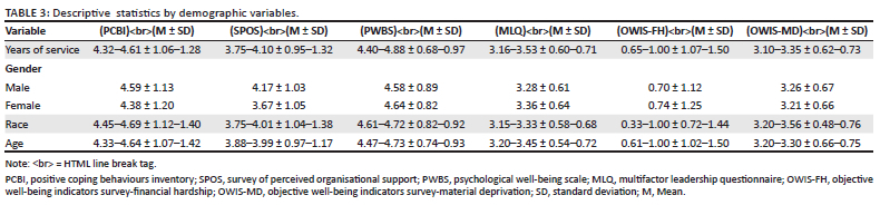 Biographical questionnaire: The researcher obtained the biographical details (age, race, gender and years of service) by including a biographical questionnaire in the instruments. Collecting this information was important because demographic variables have been shown to significantly influence employees' experiences of well-being (Schaufeli, 2017). Factors such as age, race, gender and tenure can shape individuals' perceptions of organisational support, access to resources, exposure to stressors and coping mechanisms. Understanding these demographic influences allows for a more nuanced interpretation of the well-being results and helps identify specific groups that may require targeted interventions.