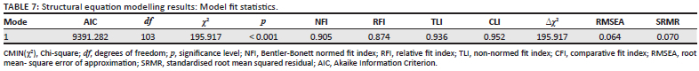 To ensure the integrity and validity of the dataset, a comprehensive preliminary data screening process was conducted prior to analysis. Of the 252 survey responses received, 218 fully completed questionnaires were included in the final analysis. Thirty-four partially completed questionnaires were excluded because of missing responses that could compromise the reliability of the analysis. Within the retained cases, there were no item-level missing data, as participants were required to complete all items before submission. The response rate of 15.1% reflected the voluntary nature of participation and logistical challenges posed during the COVID-19 pandemic. To check for assumptions of normality, skewness and kurtosis values were assessed, with thresholds within the acceptable range of ± 2 and ± 3, respectively (George & Mallery, 2024; Kline, 2005). Multivariate normality was examined through univariate checks, bivariate scatterplots and standardised regression residuals. Outliers were investigated using z-scores (values exceeding ± 3) and Mahalanobis distance to detect multivariate outliers (Babbie & Mouton, 2011; Hayes, 2018). In addition, assumptions of linearity, homoscedasticity, multicollinearity and singularity were assessed using scatterplots, Levene's test, tolerance values, variance inflation factors (VIF), eigenvalues and condition indices. These procedures ensured that the data met the necessary assumptions for multivariate analyses, enhancing the robustness and credibility of the statistical inferences.
