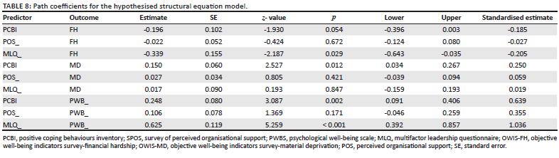 Positive Coping Behaviours Inventory: The Positive Coping Behaviours Inventory (PCBI) was used to measure the organisational PCBs. The PCBI is a 41-item inventory developed by Marx (2017), which uses a 6-point Likert-type scale (1 = definitely agree; 6 = definitely disagree). According to Coetzee et al. (2017), the reported internal reliability coefficients of the PCBI are above 0.79 for all four subscales. Regarding reliability, previous research shows acceptable threshold values ranging from 0.82 to 0.95 for the internal consistency coefficients of the PCBI (Coetzee et al., 2017).