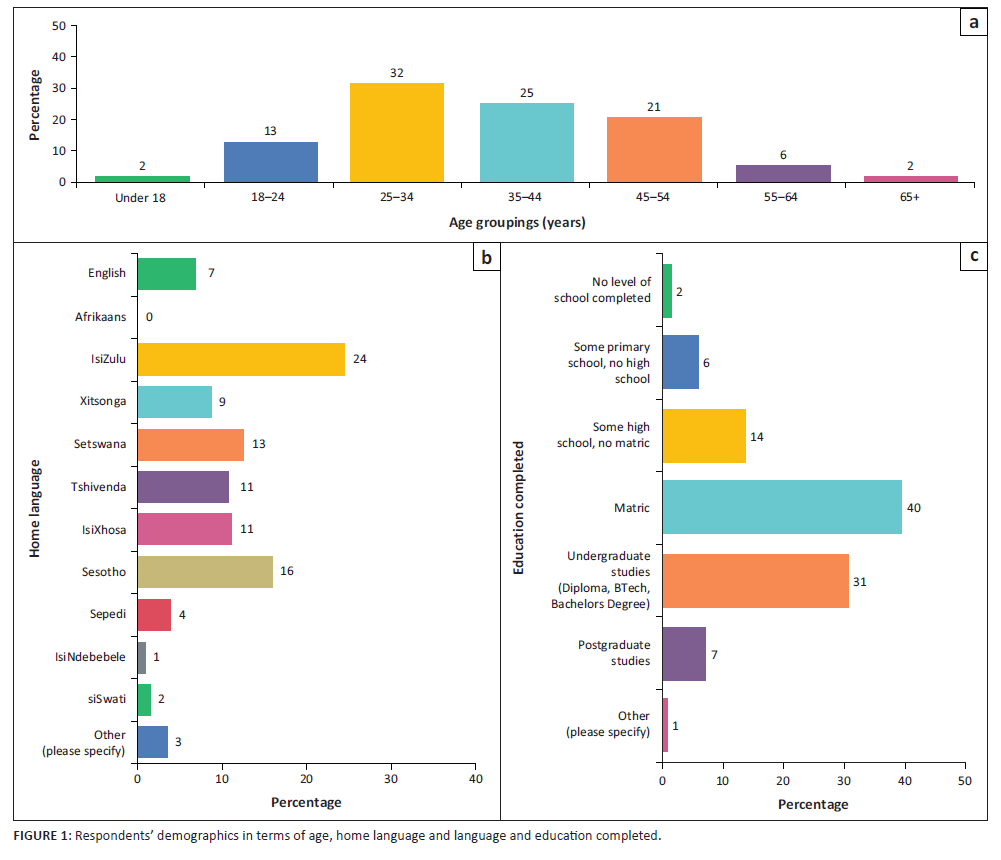 The languages spoken in Soweto are quite diverse, with isiZulu spoken by 24% of the respondents, followed by Sesotho (16%), Setswana (13%) and isiXhosa and Tshivenda at 11%, interesting to note that English represented only 7% with no Afrikaans-speaking respondents. The 3% other language speakers spoke Shona, Yoruba, Portuguese, Amharic, Urdu and Swahili. In terms of completed education, 40% of the respondents had completed matric, 31% had completed undergraduate studies and 7% had completed postgraduate studies.
