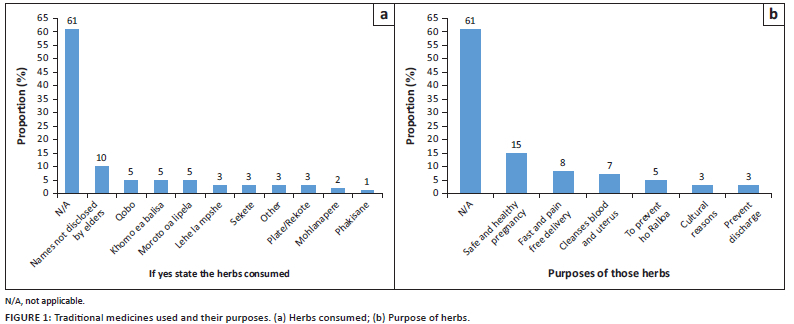 The participants' most commonly used traditional medicines were Qobo, Khomo ea balisa, Moroto oa lipela, Lehe la mpshe, Sekete, Plate or Rekote, Mohlanapere and Phakisane. This finding is consistent with the results of a quantitative study conducted in Lesotho, which indicates that traditional herbs such as qobo, phakisane and khomo ea balisa play an essential role in treating reproductive problems and in the lives of pregnant women.29 However, different traditional remedies were reported in a study conducted in KwaZulu-Natal Province, South Africa.8 Variations of traditional remedies used across countries may be because of differences in cultural traditions and vegetation types.