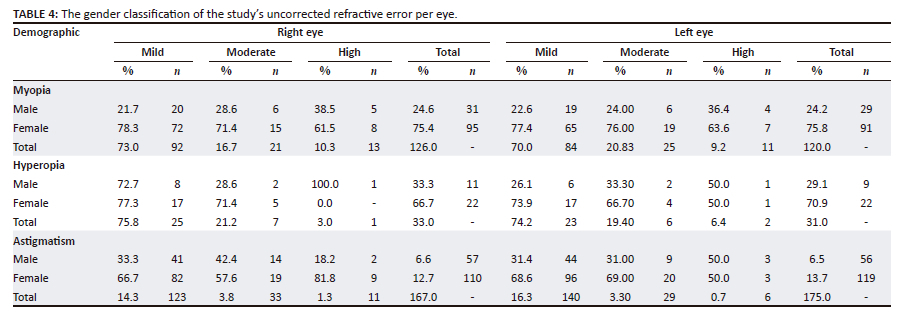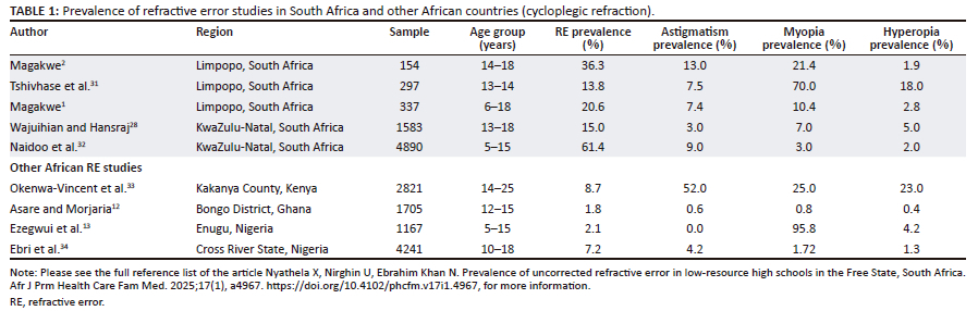 The proliferation of digital devices, accompanied by sedentary lifestyles and the inaccessibility of optometry services for children from disadvantaged backgrounds, prompted the undertaking of this study. To the authors' knowledge, the prevalence of URE in the Free State province is unknown, unlike in other regions of the country (Table 1). Furthermore, this research sought to study one of the most vulnerable cohorts of schoolchildren. Moreover, older school-going children are more prone to URE than their counterparts.1,20 To elucidate further, myopia among high schoolchildren (13-15 years) increased to 12.8% from 1.1% among their primary school counterparts (7-9 years).21 Another study highlighted myopia among the 14-year-olds to be 6.3%, which increased to 9.6% among the 15-year-olds.22