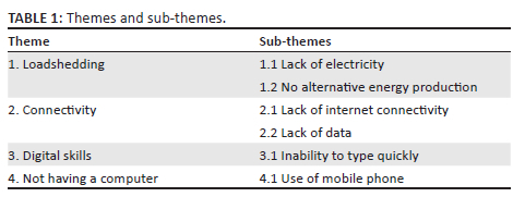 Sociodemographic characteristics of participants who included males and females, whose ages ranged from 32 and years 55 enrolled in the post-basic BCur (Ed et Admin) programme. Participants experienced online learning negatively as evidenced by identified themes (Table 1) that included loadshedding, connectivity, digital skills and not having a computer. These are demonstrated in the quotes as outlined in the following sub-sections.