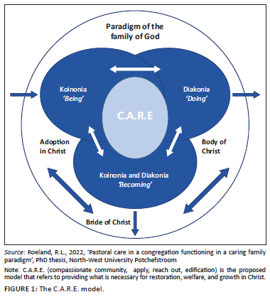 The C.A.R.E. model describes the nurturing purpose of the family of God who caringly receives the newly adopted child into the compassionate community (koinōnia) and models (diakonia) the 'being-function' of the new God-given identity. Understanding the 'being-function' leads to the application of the God-given identity ('doing-function') through the development of the gifts and functions within the Body of Christ. The continuous need to grow towards maturity in Christ ('becoming-function') necessitates the need for the mutual edification of the Bride of Christ. The process of the C.A.R.E. model directs the growth of the newly adopted child in Christ towards maturity through the mutual care of the family of God by enhancing the interaction of koinōnia and diakonia within church congregations to promote the health of the congregation. Instead of a radical new ideal for the church, the C.A.R.E. model illustrates the optimal process that leads a child of God to a mature adult in Christ.
