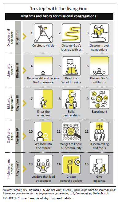 In the development of 'In step', some of these phases were used. However, in its iterated state, five phases were developed. Niemandt notes how important it is to develop a language house and social imagination in the process of creating a missional culture (Niemandt 2019b:145-147). To create a language house for 'In step', the phases were translated into the language house of rhythms and symbols were created for every habit (see Figure 1). The five rhythms of 'In step' are: