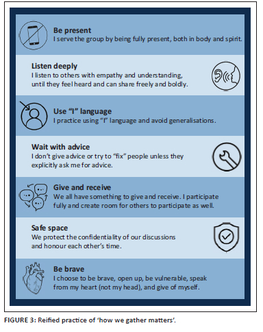 Holding environments are used in several missional models of creating cultural change. Within the holding environment, specific practices are introduced, and through time these practices are reified. Wenger (1999:58) notes that communities of practice develop a repertoire of practices as well as reified materials. He discusses reification in the context of communities of practice as the process of turning collective knowledge and experiences into tangible objects or representations. Reification involves making abstract concepts or practices more concrete and accessible for members of the community. As a community of practice, 'In step' makes their resources available on Canva design software for easy adaptation contextualisation in local contexts. See Figure 3 - 'how we gather matters'- as an example.