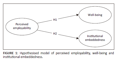 This study addressed two important gaps: insufficient research concerning FA students and being the first study to investigate the relationships between students' self-perceived graduate employability, well-being and embeddedness in a higher education institution. Financial accounting students with a strong sense of perceived graduate employability will have good mental health and be embedded in their higher educational institutions. The following hypotheses were set: Hypothesis 1 (H1): perceived employability of FA students predicts their well-being. Hypothesis 2 (H2): FA students' perceived employability predicts their IE (Figure 1).