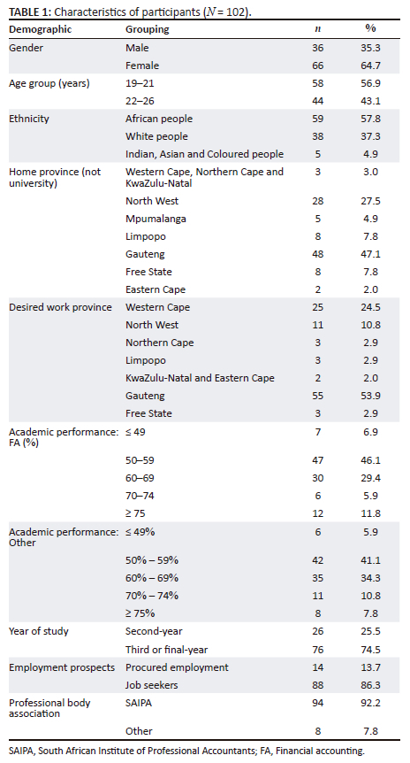 Participation of females surpassed that of males by two-thirds. Participants differed in age, which ranged between 19 and 26 years, and their ethnicity, which included five ethnic groups in SA, with African people (57.8%) as the strongest representation. Academic performance in their core module of financial accountancy ranged from high to low, with 17.7% of participants achieving above 70% and 11.8% of these acquiring distinctions. In comparison, 6.9% failed the same module at the sampling time. Most participants achieved grades ranging between 50% and 69% for the FA module (75.5%) and the average of all other modules (75.4%). Most participants were registered for their final year of study (74.5%), planned on registering with the SAIPA professional association (92.2%) and had not procured employment yet (86.3%).