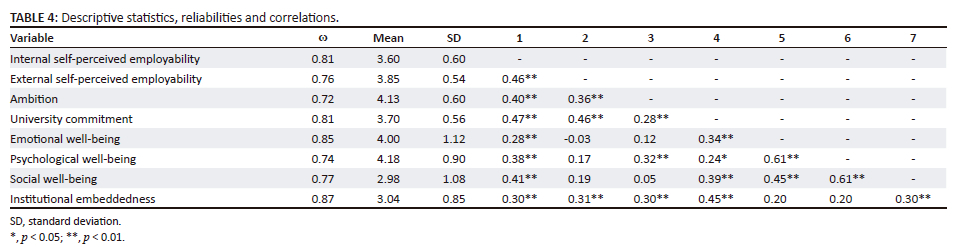 Institutional embeddedness had moderate correlations with internal self-perceived employability (r = 0.30), external perceived employability (r = 0.31), ambition (r = 0.30), UC (r = 0.45) and social well-being (r = 0.30).