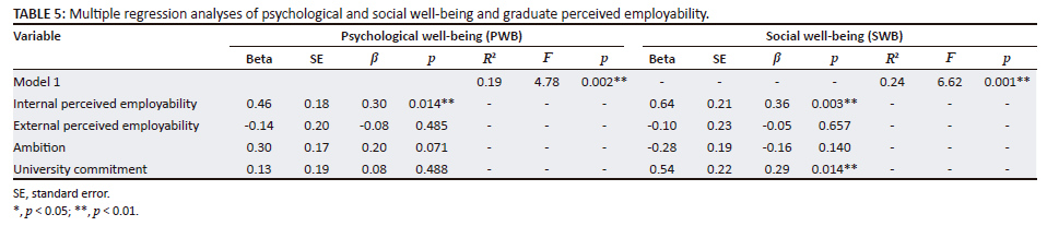 Table 5 shows that psychological well-being is predicted by employability (F = 4.78, p = 0.002, R2 = 0.18). The standardised regression coefficient of internal perceived employability (β = 0.30) is statistically significant (p = 0.014). Social well-being is also predicted by employability (F = 6.62, p < 0.001, R2 = 0.24). The regression coefficients of both internal perceived employability (β = 0.36, p = 0.003) and UC (β = 0.29, p = 0.014) are statistically significant.