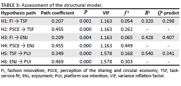 In the partial least squares (PLS) structural equation modeling, the individual path coefficients can be standardised beta coefficients in ordinary least squares regressions, and path coefficients can be used to measure the effect of exogenous variables on endogenous variables. The present study employed bootstrapping with 5000 resamplings for hypothesis testing, and the corresponding p-value was used to assess the significance of the hypotheses. Hair et al. (2019) stated that the p-value should be smaller than 0.05. As presented in Table 3, all the effect directions of the structural paths were positive, validating the theoretically assumed relationships between latent variables.