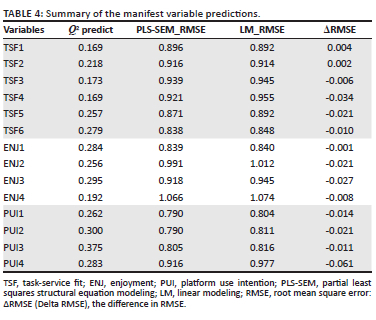 The empirical model's predictive quality was evaluated using PLSpredict (Shmueli et al., 2016). The Q2predict values of TSF (0.298), ENJ (0.407) and PUI (0.341) were greater than zero (Table 3). Because these values were positive, the corresponding prediction error was smaller than the naive mean value prediction, indicating that the constructs achieved satisfactory predictive power within the empirical model (Shmueli et al., 2019). Furthermore, predictive power was assessed using manifest variable predictions (i.e. items of endogenous constructs) by using PLSpredict (Hair, 2021). For most TSF items, the root mean square error values obtained through PLS-SEM were smaller than those obtained through linear modeling, indicating a moderate predictive capability (Table 4). Additionally, for the indicators of ENJ and PUI, all the root mean square error values obtained through PLS-SEM were smaller than those obtained through linear modeling. Thus, those constructs can be interpreted as exhibiting strong predictive power (Hair et al., 2019).