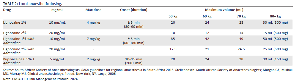 When doing any anaesthetic, it is important to always be well prepared. Good preparation, good clinical practice and adherence to national guidelines will decrease the incidence and severity of common and predictable anaesthetic complications. Difficulty can arise in low-resource settings where a reliable supply of electricity, pulse oximeters and oxygen is often lacking. However, as a basic standard of care in an ED setting, standard monitoring and functional resuscitation equipment and drugs are required. The skills and equipment to convert to a GA if required should always be in place.7 Not all generalists are comfortable with converting to GA. Adequately trained providers are, however, essential, an ongoing challenge where there is a high turnover of staff and a lack of training and support. Valid informed consent must always be obtained from the patient, advising them on the most appropriate technique that will depend on patient characteristics and experience of the clinician. Risks and benefits of the proposed technique and alternatives should be discussed. In the theatre setting, patients must be aware that a GA may still be required if RA is used as an adjunct or if an incomplete block occurs. The patient should be provided with enough information, covering risks and benefits, complications, expected duration of action of the block, how to care for the insensate limb (particularly minor blocks seen in the ED that are discharged), red flags, the socioeconomic setting and when to return to the clinic or district hospital.7 As a general rule, there are no clear-cut indications for one type of anaesthesia over another when either would be appropriate. Absolute contraindications should be excluded, such as known allergy to drugs or patient refusal. Bleeding diathesis is a relative contraindication, especially if the block is performed in an area where compression is possible. Active infection at the site of injection, pre-existing neurological deficit and poor patient cooperation are further relative contraindications. Anti-coagulation therapy is not a contraindication if stopped within the minimum recommended time before the block is performed.7 Thorough documentation should be done. Resuscitation equipment must be immediately available, and intravenous (IV) access established before the procedure. The practitioner must ensure the block is fully established, vital signs and physiological parameters are within normal limits and the patient is stable.1 Ensure an emergency trolley is immediately available for the management of complications and that the practitioner is skilled to rapidly recognise and treat these. Ensure appropriate measures are taken to minimise the risk of inadvertent nerve damage during the procedure. Always check and label drugs to be used to prevent error. In an ideal setting, a multidisciplinary team including nurses, doctors and clinical associates should work together to perform RA blocks. The team should be trained to prepare equipment and drugs, provide monitoring and have basic knowledge in evaluating the levels of pain and effects of RA.1 In the chaos of busy district casualties, there needs to be guidance as to which patients are good candidates for RA and which patients are not.