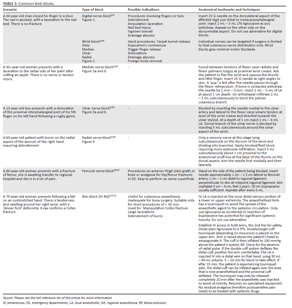 Common blocks that can be used in the emergency departments and for minor procedures in district hospitals and clinics (see Table 3 for common limb blocks):