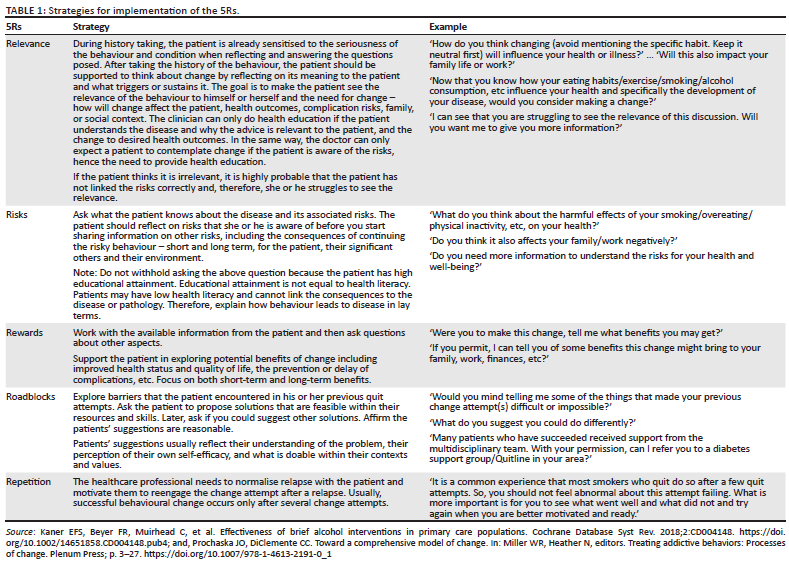 In conclusion, behavioural change is not an easy endeavour, and not all patients are willing to embark on the journey for many reasons. The clinician must be capacitated to know what to do for the latter category of patients. The 5Rs approach is an evidence-based approach to supporting and motivating unwilling patients to embark on the journey of behavioural change.