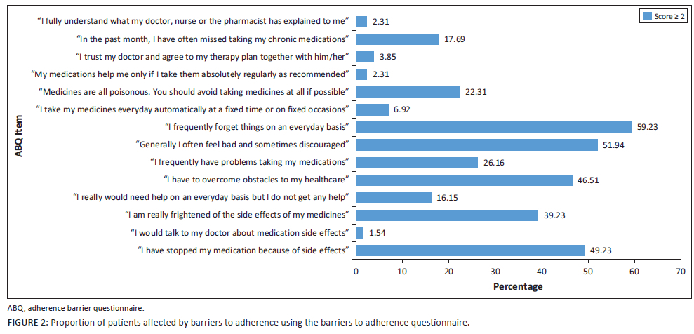 RESULTS: Descriptive statistics and logistic regression were used for analysis. Most patients were female (63%) with a mean age of 72 (67-78) years. Common comorbidities included type 2 diabetes mellitus (63%), hypertension (98%), dyslipidaemia (92%) and congestive cardiac failure (38%). Polypharmacy was prevalent, affecting 53% of the participants. Despite 96% of participants being adherent, all had at least one barrier to adherence, with the majority (65%) having more than one barrier. The main barriers were forgetfulness (59%), fear of side effects (39%), problems with taking the medications (26%) and believing medications are poisonous (22%). Although most participants accessed the pharmacy easily, only 83% reported consistent medication availability and 11% could not afford to collect their medication.