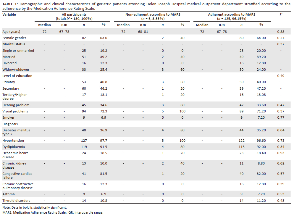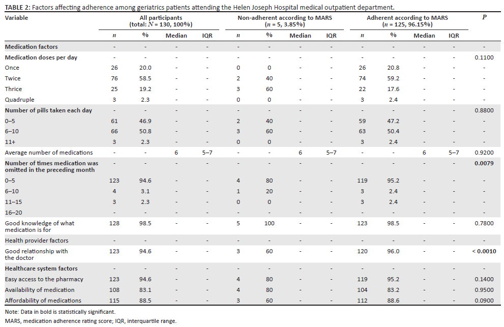 BACKGROUND: Adherence to medication represents a challenge in managing chronic conditions in the geriatric population. This study assessed adherence rates and factors affecting adherence of geriatric patients attending the Helen Joseph Hospital outpatient department