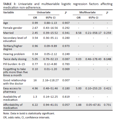 Table 3 shows some of the independent factors associated with adherence in our study participants. Having a good relationship with the healthcare provider and the affordability of medication tended towards statistical significance.