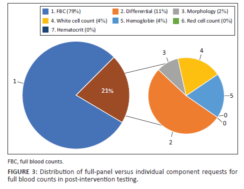 The data showed a shift in blood test ordering practices, with a decrease in full-panel requests for FBCs and an increase in requests for individual components such as haemoglobin, differential, white cell count and haematocrit. Before the intervention, 87% of all FBC requests were for full panels, compared to 79% post-implementation, indicating more targeted test ordering. However, this trend was not observed with U&Es, where the proportion of full-panel requests increased from 96% to 100% of all U&E requests post-implementation. This indicates that fewer individual components of the U&E were being requested after the intervention. Nevertheless, the total number of full U&E panels requested per day decreased by 52.5% post-implementation, demonstrating more conservative requesting by medical practitioners.