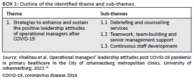 Box 1 presents an overview of the themes and sub-themes that emerged from the data analysis. The central theme that emerged was the need for the development of strategies to enhance and sustain the positive leadership attitudes of operational managers after COVID-19.