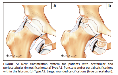 This case report draws attention to the existence of various types of calcifications around the acetabulum. The role of periacetabular calcifications in the clinical evaluation and outcomes of patients with femoroacetabular impingement requires further investigation, and this new classification of acetabular and periacetabular rim ossifications may be helpful.