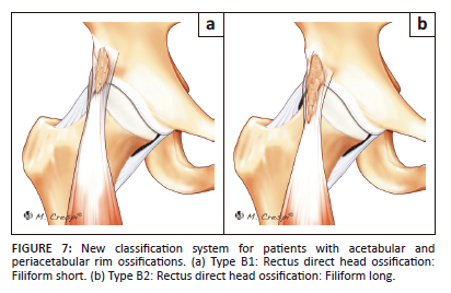 This case report highlights the existence of various types of calcifications and ossifications around the acetabulum, and we propose a new classification system for patients with acetabular and periacetabular rim ossifications or calcifications (Table 1, Figure 5, Figure 6, Figure 7 and Figure 8). The value of plain radiographs is very important as these small areas of calcification or ossification are easily missed on MRI. Distinction between the acetabulum (bone), acetabular rim (rim) and periacetabular (at a distance from the rim) locations of the calcifications is very important for the diagnosis. The presence of small multiple punctate labral calcifications (Type A1) should alert the reporting radiologist to look for features of FAI as well as dysplasia and osteoarthritis. Os acetabuli (Type A2) represent persistent secondary ossification centres that may have been prevented from fusing by repetitive impingement and acetabular rim stress fractures, and are usually the result of chronic repetitive microtrauma. Thus, the presence of these entities should alert the radiologist to look for features of acetabular overcoverage and impingement. Os acetabuli may be bilateral, round or ovoid in shape, often corticated with a concave lateral border and convex medial border and are usually situated slightly away from the acetabulum, separated by an oblique radiolucent line. In contrast, acetabular rim stress fractures (Type A3) have a straight medial border with a vertical cleft separating them from the acetabulum. B1-B3 refer to calcific tendinitis of the direct head of the rectus but the radiologist should be aware that there are other causes of mineralisation related to the proximal rectus such as anteroinferior iliac spine avulsions or the different types of subspine impingement. Type C (heterotopic capsular ossification) represents true ossification and thus may appear more dense and corticated on imaging. There are four types of HO as described by Brooker.9 Type 1: Islands of bone within the soft tissue about the hip. Type 2: Bone spurs from the pelvis or proximal end of the femur, leaving at least 1 cm between the opposing bone surfaces. Type III: Bone spurs from the pelvis or proximal end of the femur, reducing the space between opposing bone surfaces to less than 1 cm. Type IV: Apparent bone ankylosis of the hip.