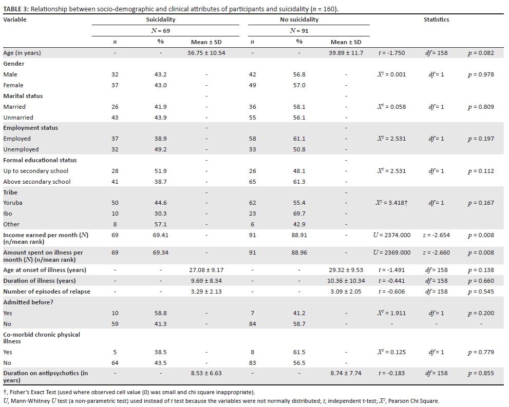 Data were analysed using Statistical Package for Social Sciences (SPSS), version 18. Comparison between categorised sociodemographic/clinical variables and suicidality was made using the chi-square test. The description of the pattern of suicidality amongst participants was done by categorising them using the most severe form of suicidal behaviour in each respondent. In a situation where a participant had more than one suicidal event, for example, if a participant had a suicidal intention and suicidal attempt, the most severe form of suicidality in that continuum being suicidal attempt was chosen for that particular participant.
