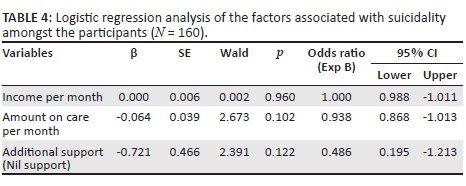 In order to determine all the variables that were independently associated with suicidality in the subjects, all variables that were associated with suicidality in previous analyses (i.e. income per month and amount spent on care monthly) were entered into binary logistic regression analysis using suicidality as the dependent variables (Table 4). However, none of these two factors was found to predict suicidality amongst the participants independently.