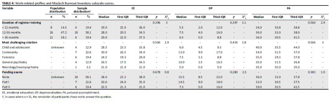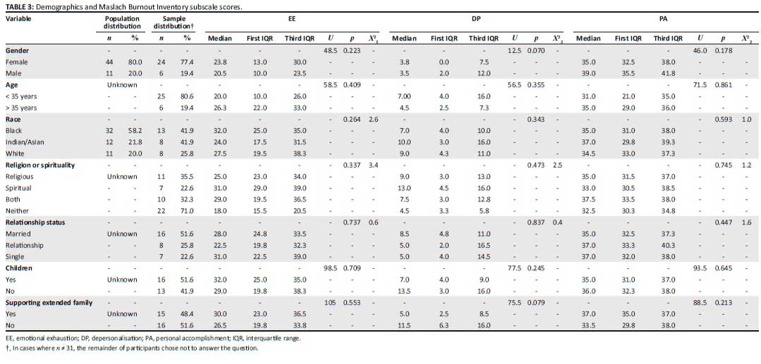 Objective 1: Descriptive statistics for EE, DP and PA were generated. Scores were categorised as high based on a threshold as per the cut-off score published in the third edition of the MBI manual8 (Table 1). These cut-off scores correlate with the scores predominantly used in burnout research.31 The higher the EE and DP score and the lower the PA score, the more likely the individual is to experience burnout.8