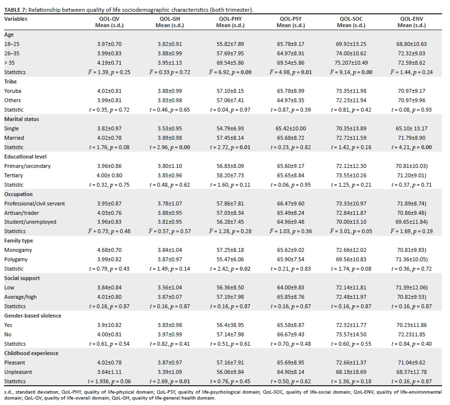 The prevalence of depression among the pregnant women who participated in the study was 7.2%. In the first trimester of pregnancy, the prevalence of depression was 30 (10.5%), while it was 11 (3.9%) in the third trimester of pregnancy. Table 6 shows the frequency of depressive symptoms among respondents. The following variables were entered into a logistic regression model age, marital status, number of abortions and childhood experience. In the overall population, women with a history of an abortion or miscarriage were independent predictors of depression and were 12 times more likely to be depressed Please expand compared with the other group (OR = 12.35, CI = 5.87-25.98, p = 0.01). Thus, having experienced miscarriage was a significant predictor of depression. Similarly, in the first trimester, having experienced miscarriage was an independent predictor of depression and were five times more likely to be depressed compared with the other group (OR = 5.48, CI = 15.46-178.20, p = 0.00). However, none of the variables accessed were an independent predictor of depression in the third trimester. Tables 7-9 show the relationship between sociodemographic variables and QoL in both trimesters, first trimester and the third trimester. Age, marital status and family type were observed to be significantly related to QoL. Other details can be found in Table 7. Table 8 shows the relationship between QoL and obstetrics and gynaecological variables. Table 9 shows the relationship between QoL and depressive illness. Collectively, the relationship between depression and QoL was significant in the overall domain, satisfaction with general health domain, psychological domain and environmental domain. Further details can be found in Table 9.