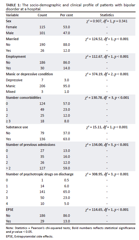 This retrospective study included 215 patients. Sample sizes in the analyses might vary because of missing data for some variables. The mean age of the patients was 35.95 years (s.d. = 12.45, range: 18-72 years). Table 1 summarises the socio-demographic and clinical profiles of the study participants. The number of females did not differ significantly from that of males (Table 1). In contrast, significantly more patients were not married than married, and significantly more patients were not employed than employed (Table 1). For the polarity of the episodes, significantly more patients had manic episodes than depressed and mixed episodes (binary post hoc), and the majority of patients had no comorbidities compared to those with 1, 2 and 3 or more comorbidities. There was a significantly higher number of patients who used substances than those without a history of substance use. Most patients had more than two previous admissions compared to those with 0-2 admissions (binary post hoc). In the category of patients on psychotropic medications on discharge, significantly more patients were on two psychotropics compared to those on 0, 1, 3 and 4 psychotropics (binary post hoc), and only one patient was on no psychotropic. Significantly more patients did not have EPSE than those who did. Finally, none of the patients were treated with ECT (see Table 1).