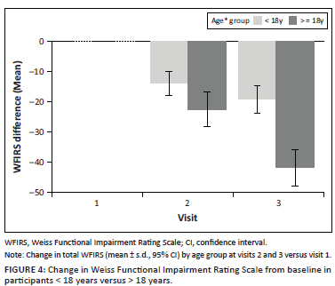 The subgroups of patients, both < 18 years of age and > 18 years of age, showed significant change in the total WFIRS versus CGI-I (p < 0.05) at visit 2 only (Figure 4).