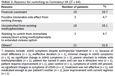 The most common reasons for the patients in switch over group to get started on Contramyl XR included financial constraint (29.7%; n = 19), inadequately controlled ADHD symptoms from the existing methylphenidate treatment (23.4%; n = 15), possible intolerable side effect from existing therapy (4.7%; n = 3) and others (37.5%; n = 24) (Table 2).